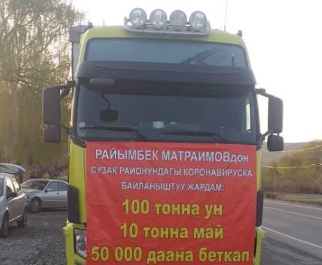 Учурда Кыргызстанда коронавирус пандемиясына байланыштуу өзгөчө кырдаал киргизилди. Буга байланыштуу демилгелүү жарандар колунан келген жардамын берип жатышат. Алгач карантинге алынган Жалал-Абад облусунун Сузак районуна жардам иретинде Райымбек Матраимов 100 тонна ун, 10 тонна май жана 50 миң даана беткап жөнөттү.