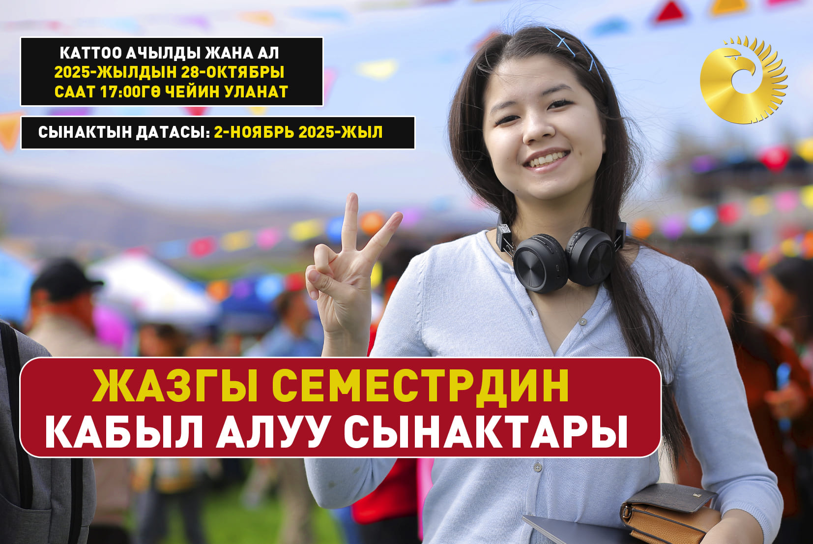 Абитуриенттер үчүн маанилүү маалымат! Биз жазгы семестрдин кабыл алуу сынактарына каттоону ачып жатабыз. Эгер сен күзүндө окууга тапшыра албай же окууга тапшырууга жетишпей калган болсоң, башка ЖОЖдон которулуп жатсаң, анда алдыда күтүлүп жаткан сынакка катталып, январда окуп баштоо мүмкүнчүлүгү бар.