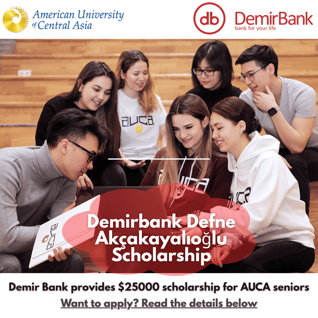 ЗАО «Демир Кыргыз Интернэшнл Банк», первый международный банк в Кыргызской Республике, и Американский Университет в Центральной Азии подписали дополнение к Меморандуму о Сотрудничестве. В рамках достигнутой договоренности учреждена специальная стипендия имени Дефне Акчакаялыоглу от Демир Банка для лучших студентов университета на сумму 25,000 долларов США.